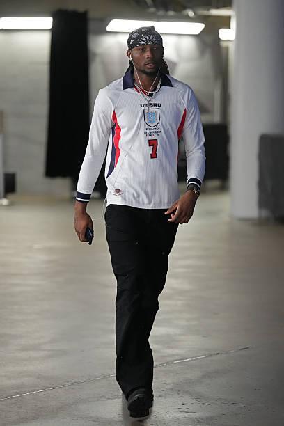 赛前,库明加身着贝克汉姆英格兰队1998年世界杯球衣入场。